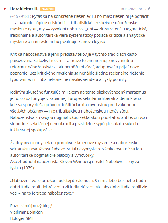 obraciam sa na Vás v súvislosti s Vašimi nedávnymi vyjadreniami v článku „Greta Thunberg ako obeť konzervatívnej a klerikálnej dezinfoscény: útok na vedu, racionalitu a ľudskú dôstojnosť“ a v diskusii pod jedným mojim starším článkom „Biblia ako základ morálky môže fungovať“. V tejto diskusii ste ma ako autora článku označili za „autistického psychopata“, tykali bez môjho súhlasu a osočovali bez akejkoľvek snahy o racionálnu a vecnú diskusiu.